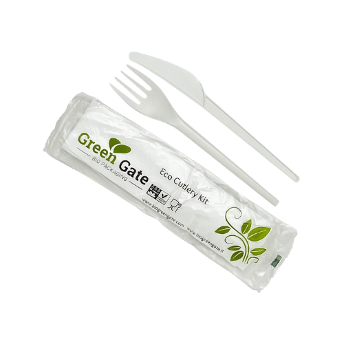 Kit completo coltello, forchetta e tovagliolo in CPLA compostabile, soluzione pratica per ristorazione take away sostenibile. Questo set monouso biodegradabile bianco imbustato offre tutto il necessario per il consumo in movimento. Le posate in bioplastica da amido di mais resistono a cibi caldi e freddi. Smaltibile nell'organico, rappresenta la scelta eco-friendly per delivery e asporto professionali. Il CPLA garantisce funzionalità paragonabile alla plastica tradizionale con completa compostabilità. Perfetto per fast food, rosticcerie e servizi di catering attenti all'ambiente.